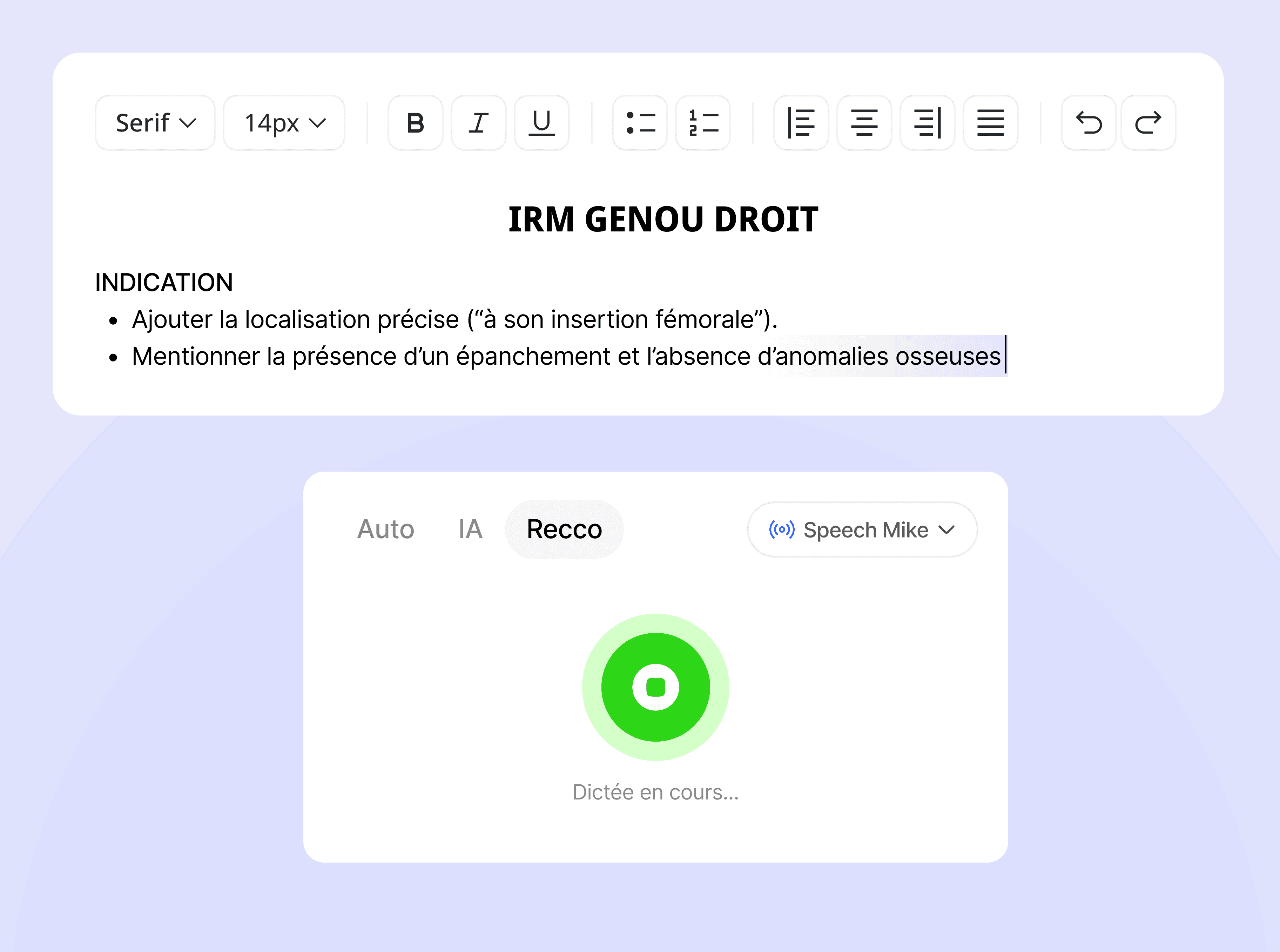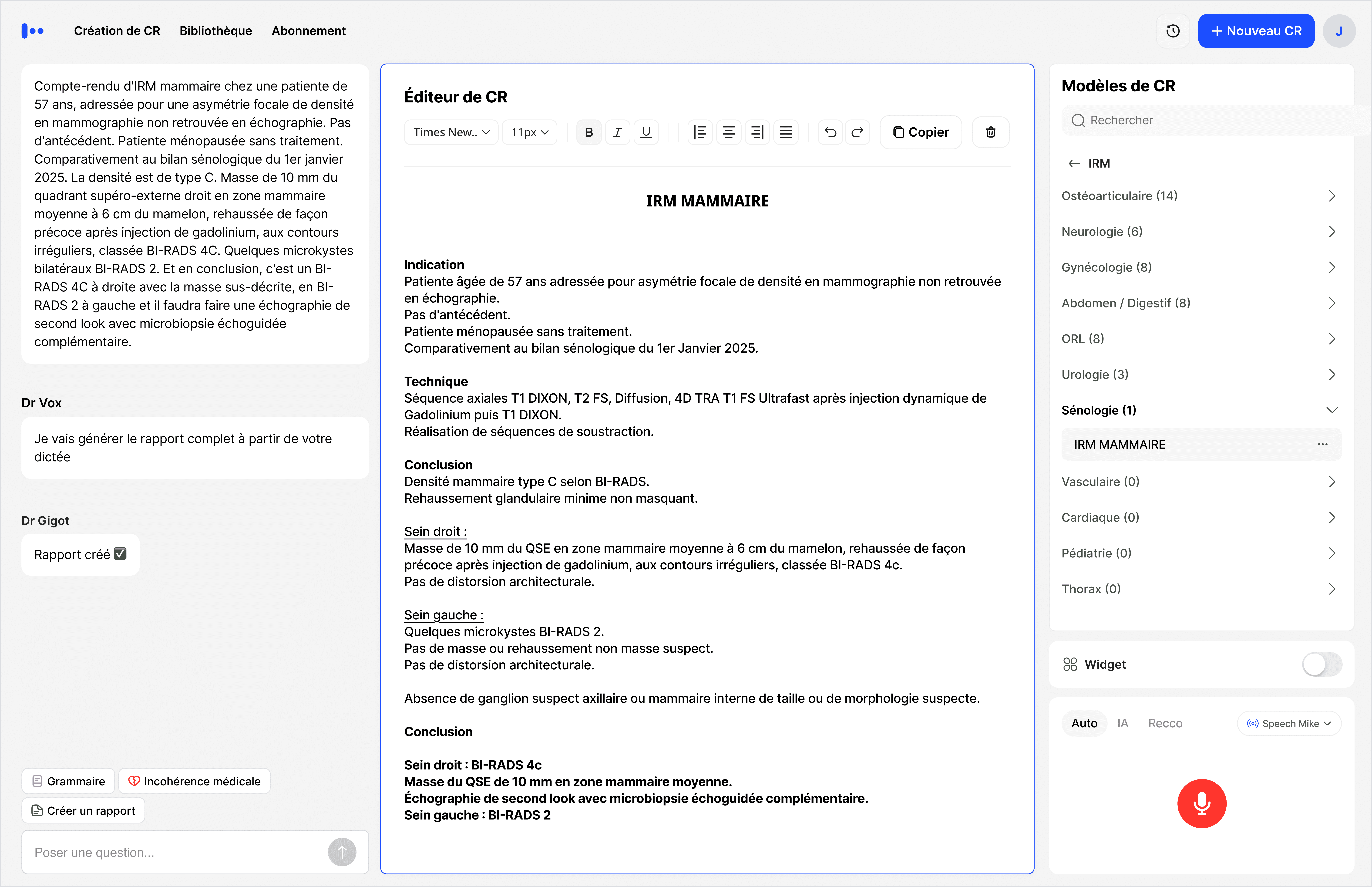 Choisissez entre le mode IA, qui analyse et met automatiquement en forme votre compte-rendu, ou le mode vocal, une dictée libre traditionnelle dans la zone sélectionnée, enrichie par l’IA avec correction automatique et bibliothèque médicale intégrée.