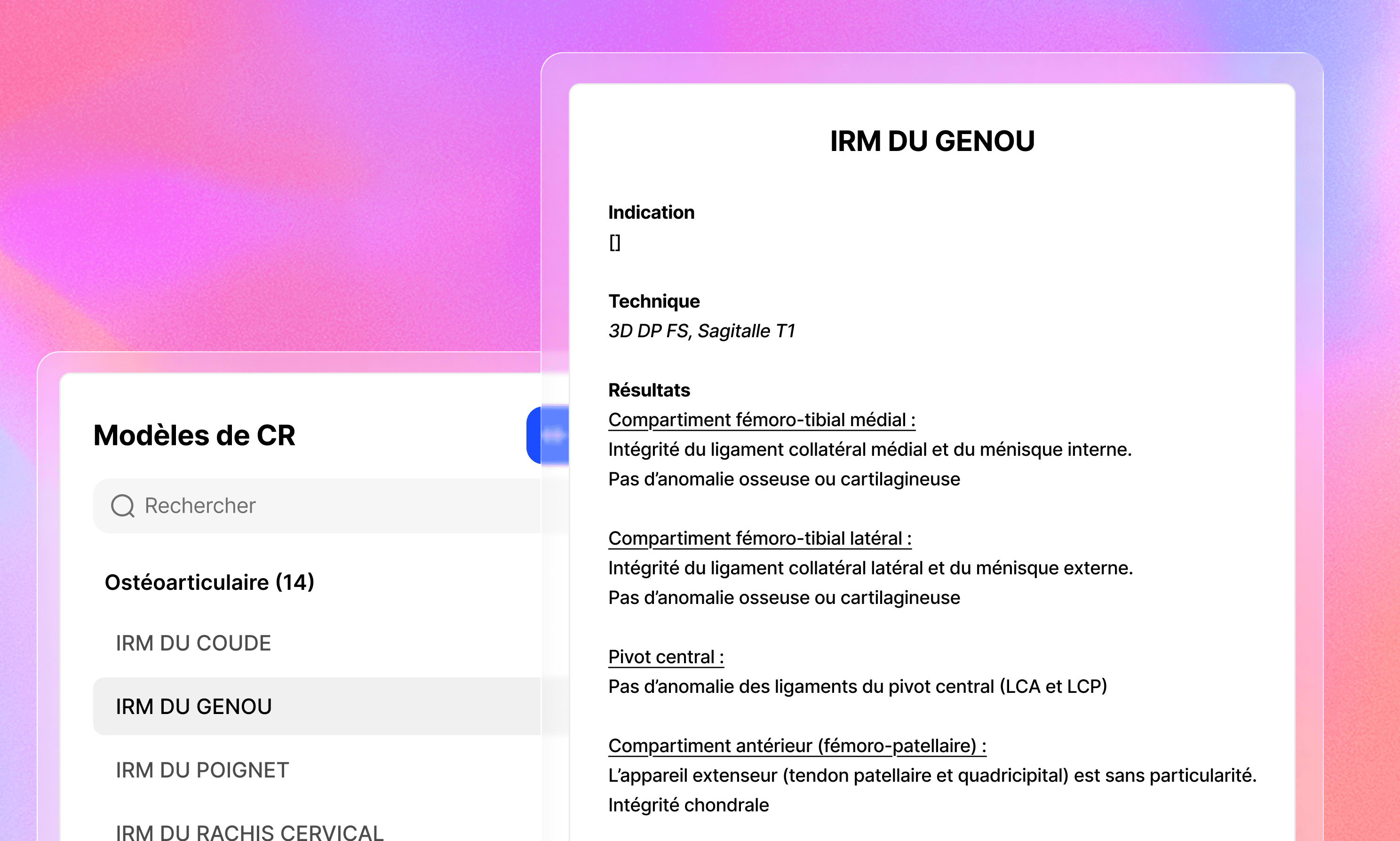 Oui. Vous pouvez importer vos anciens comptes-rendus, créer une bibliothèque complète et structurer vos modèles par modalité, spécialité ou sous-spécialité. L’IA apprend automatiquement à reconnaître et appliquer vos modèles personnalisés.